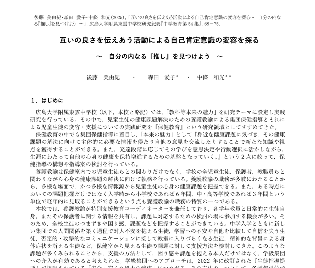 互いの良さを伝えあう活動による自己肯定意識の変容を探る : 自分の内なる『推し』を見つけよう
