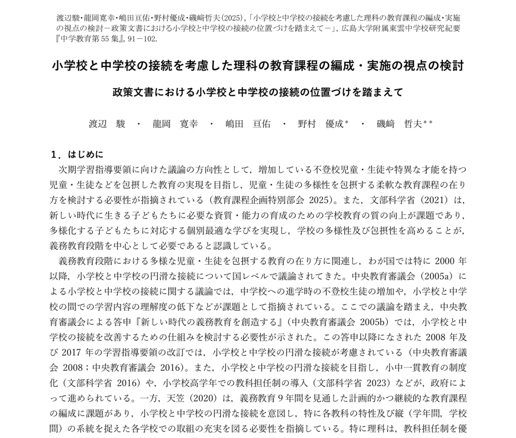 小学校と中学校の接続を考慮した理科の教育課程の編成・実施の視点の検討ー政策文書における小学校と中学校の接続の位置づけを踏まえてー