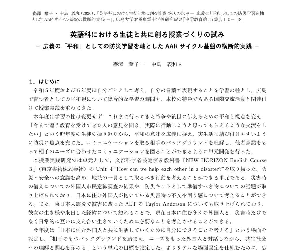 英語科における生徒と共に創る授業づくりの試みー広義の「平和」としての防災学習を軸としたAARサイクル基板の横断的実践ー