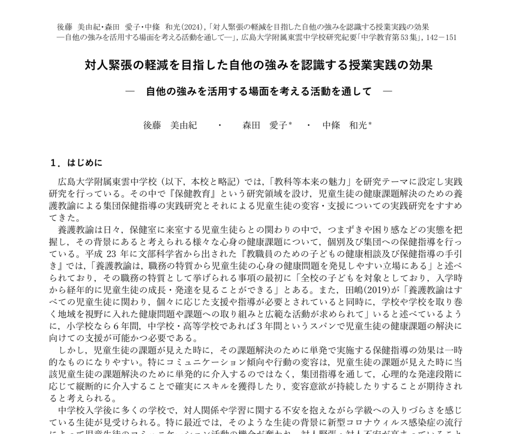 対人緊張の軽減を目指した自他の強みを認識する授業実践の効果 : 自他の強みを活用する場面を考える活動を通して