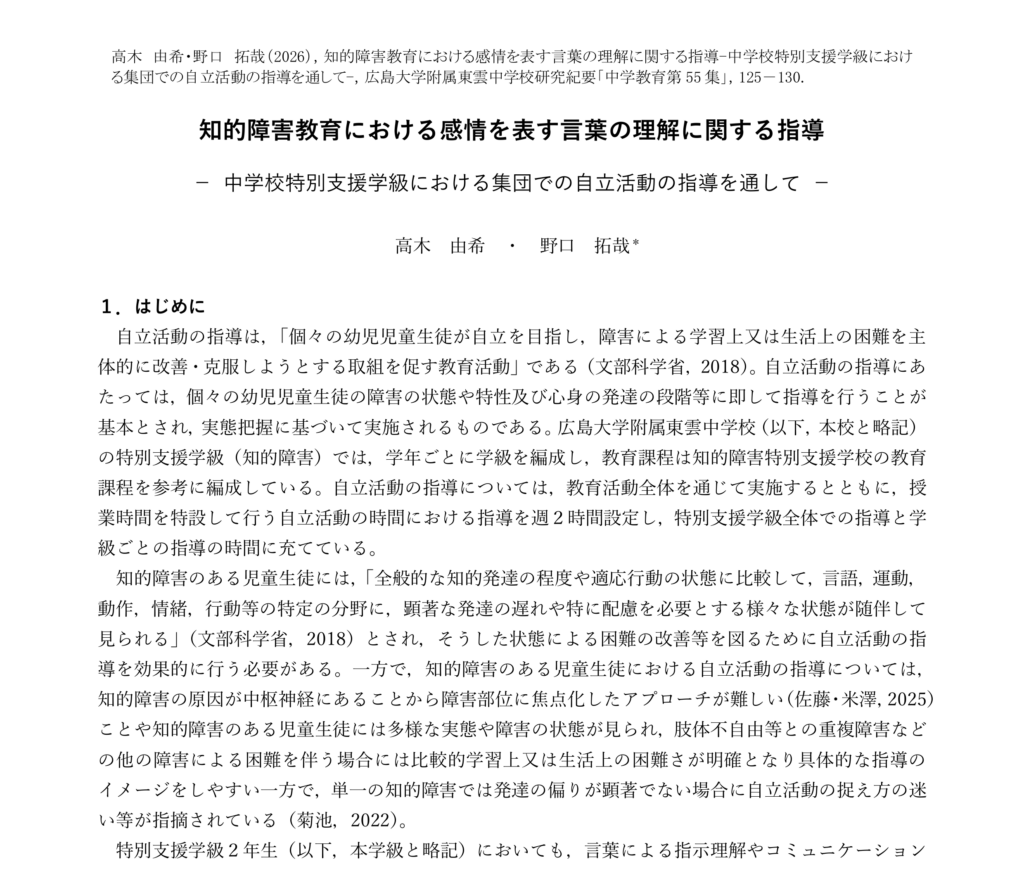知的障害教育における感情を表す言葉の理解に関する指導ー中学校特別支援学級における集団での自立活動の指導を通してー