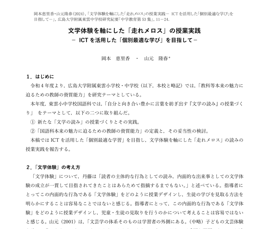 文学体験を軸にした「走れメロス」の授業実践 : ICTを活用した「個別最適な学び」を目指して